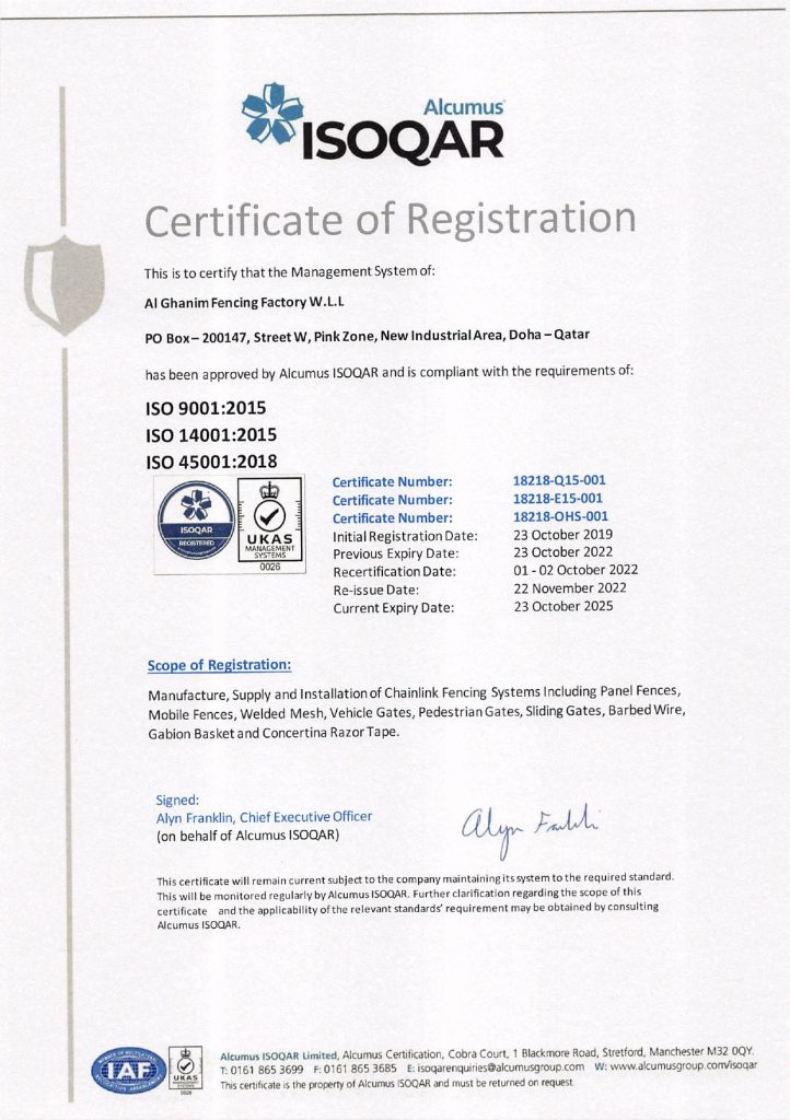 Al-Ghanim Fencing Industries has been successfully passed the following certificates :